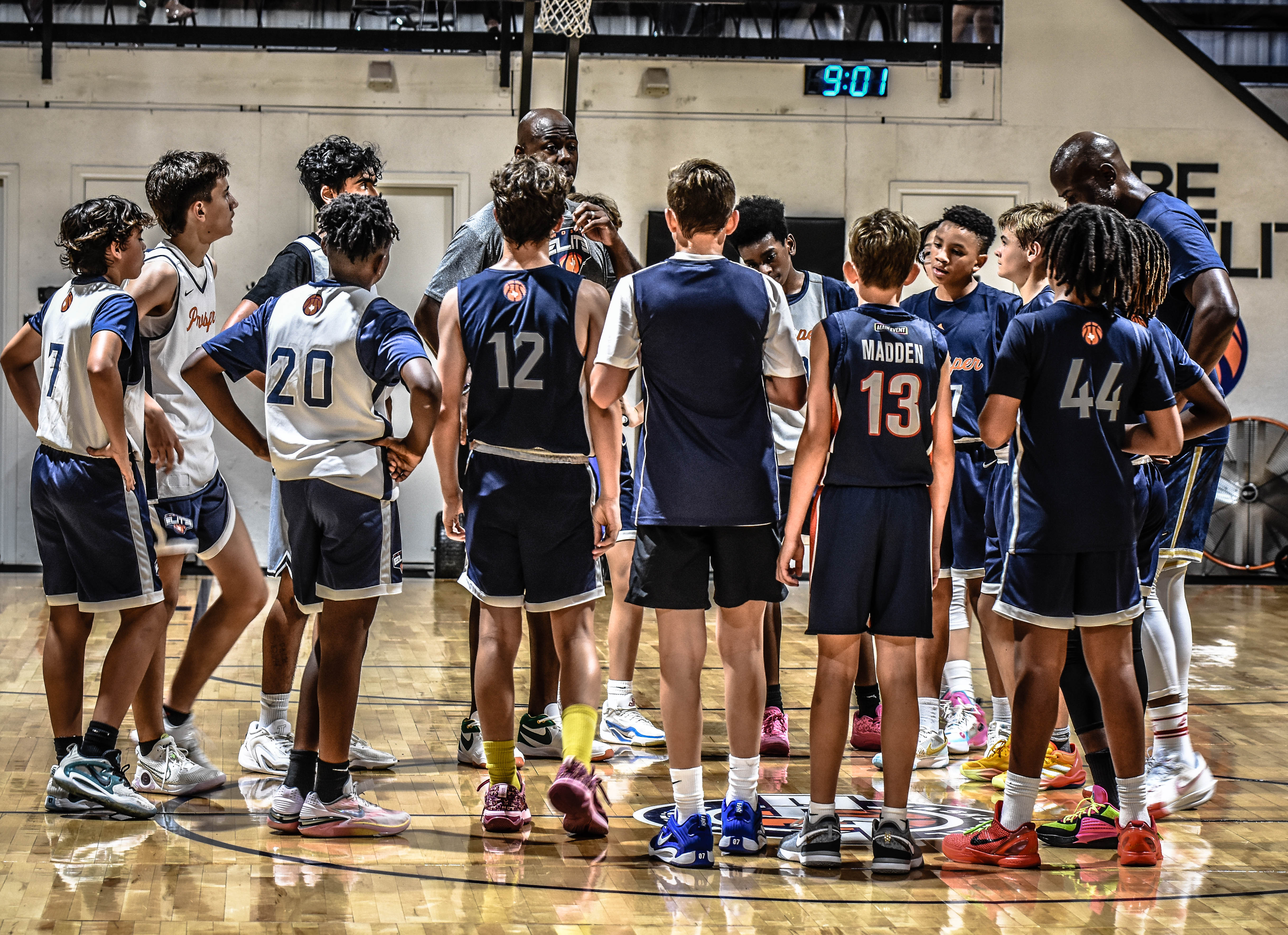 Coach William huddles his team after a win at Frisco FieldhouseUSA